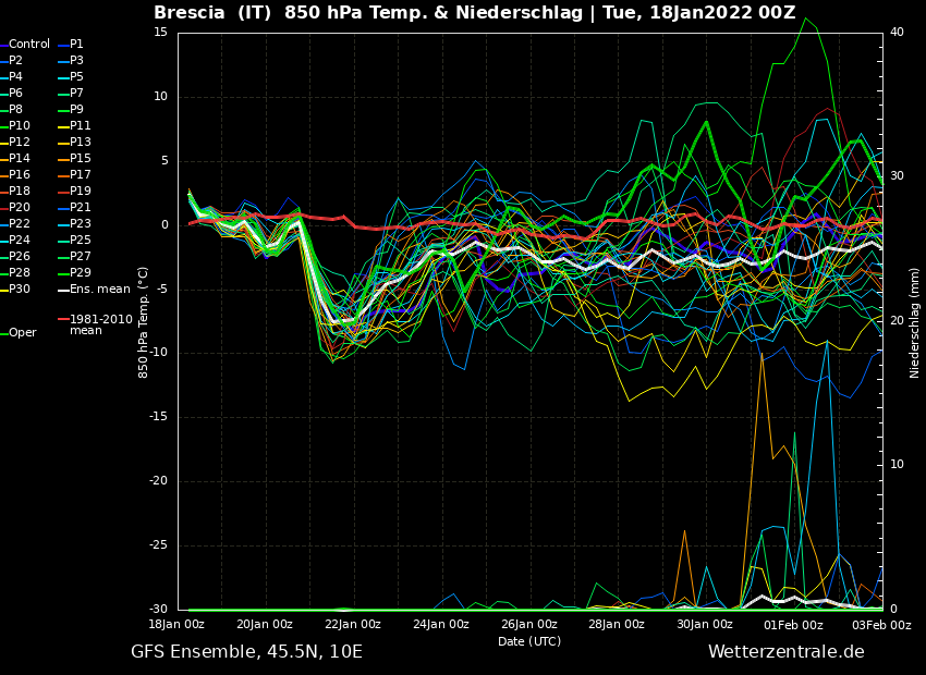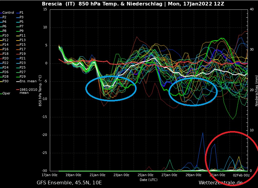 Con un colpo d'occhio dagli spaghetti serali di GFS si può vedere la prima irruzione ormai imminente (21-22 Gennaio) e quella che si sta delineando dopo il 27 Gennaio. In fondo timidamente si nota qualche spaghetto precipitativo che dà segni di vita minimi.