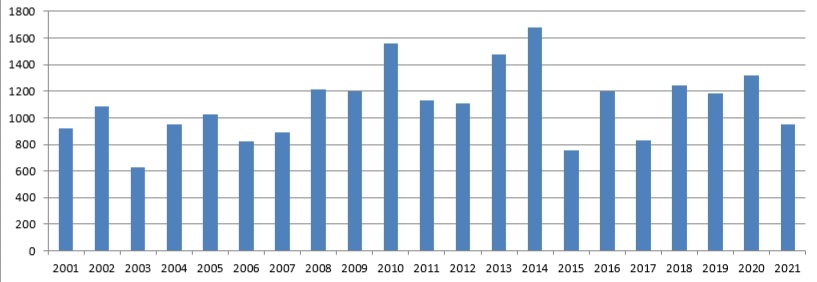 Ecco i millimetri caduti a Mompiano dal 2001 al 2021.