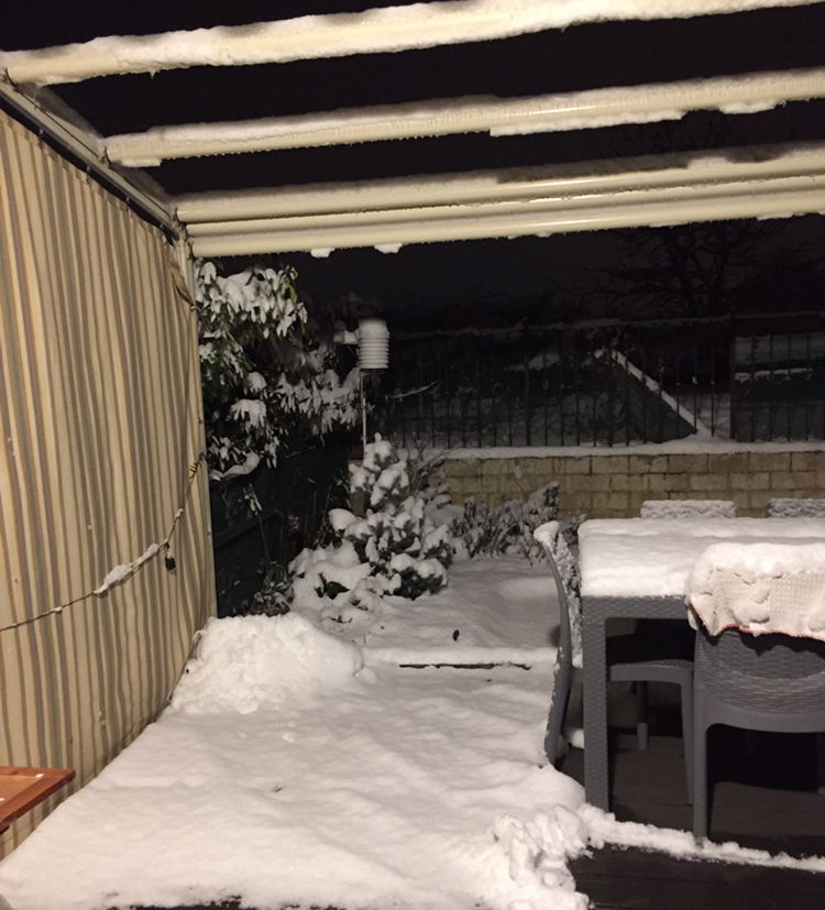 Buona sera, qui neve che raggiunge i 10 cm fatti per lo più nella mattinata, T min -3,2 T max -1,3 ora -2, strade nella mattinata orrende.. ora ha ripreso dopo una debolissima neviggine e attacca subito anche in strada