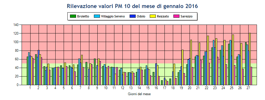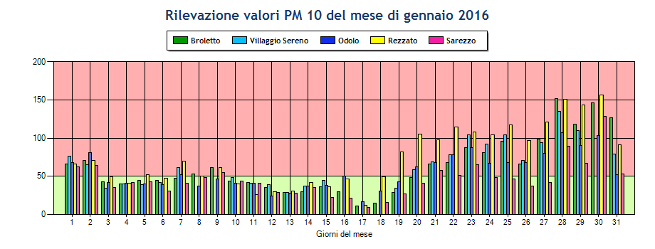 Ieri al Broletto sono stati registrati 152 microgrammi di pm10 per metro cubo d’aria, 135 al Villaggio Sereno, 151 a Rezzato, 89 a Sarezzo, 90 a Darfo e 107 a Odolo.