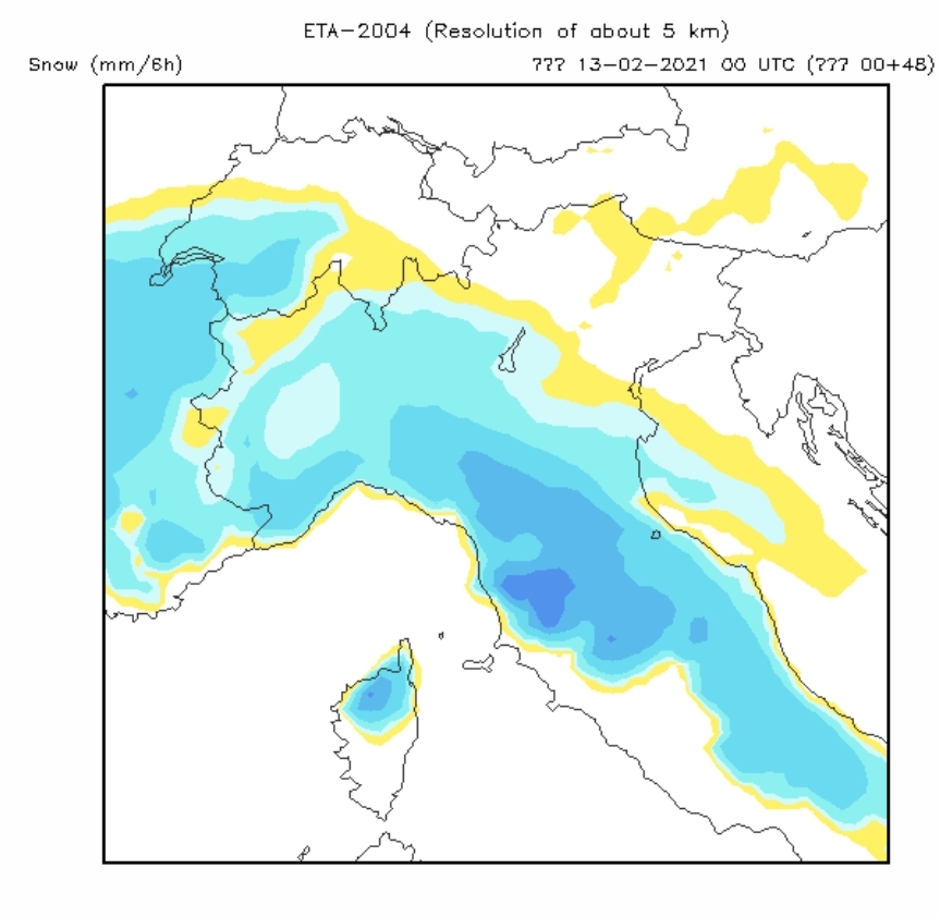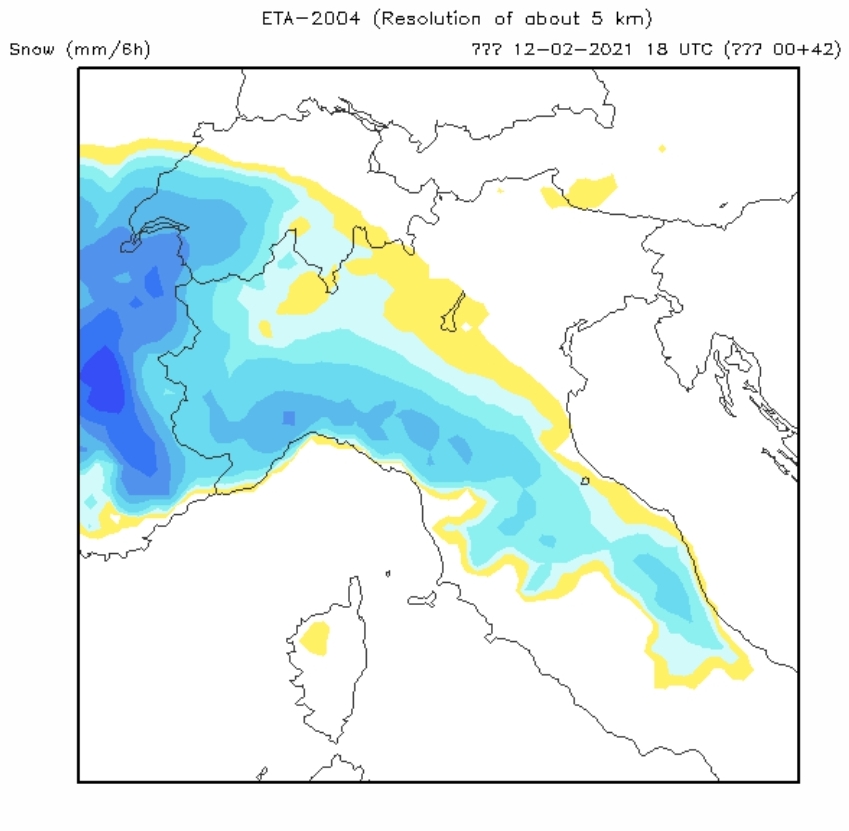 A 30h minimo meno ampio e più a SW, nemmeno 2 fiocchi si possono vedere