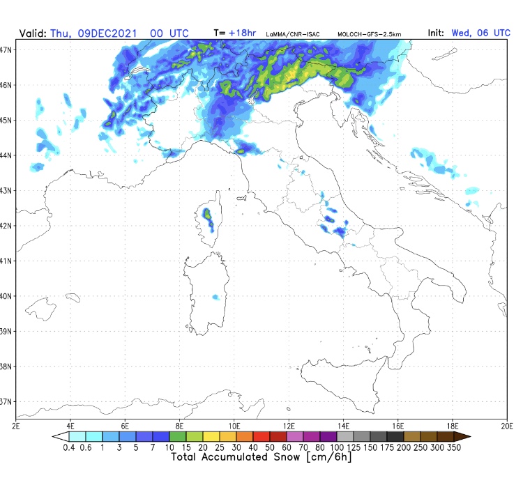 Ad eccezione del Basso Garda e dell'estremo sudest provincia, altrove la colonna è da neve sino in pianura con precipitazioni decenti: