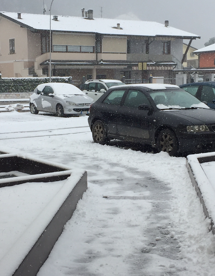 Nonostante ho spalato il parcheggio è già tt bianco di nuovo 4cm già oltre le mie aspettative per la mattinata.. neve moderata ma di ottima qualità ...