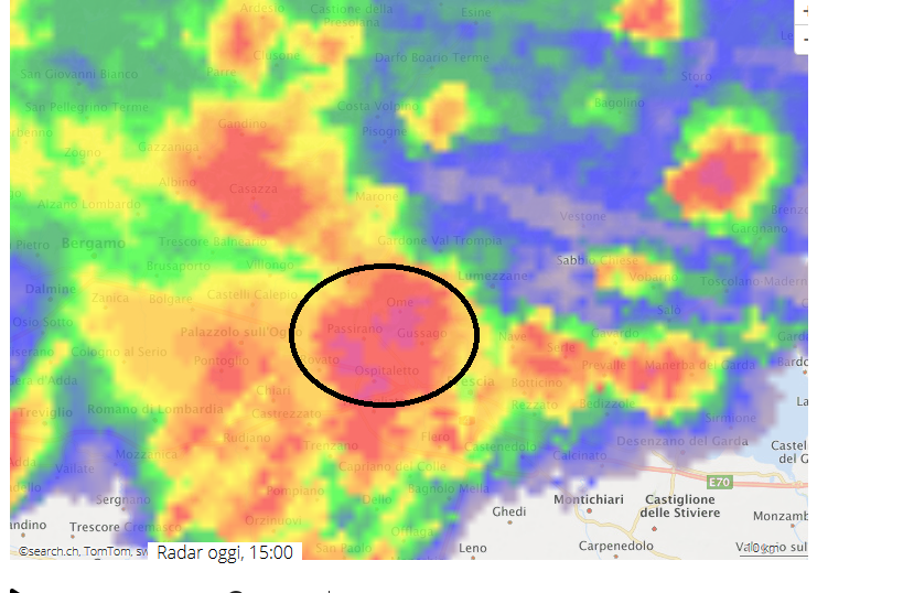 alle 15 temporale con raffiche di vento spaventose,in zona Mompiano sono riuscito a ripararmi con il quad dietro l'angolo del muro di un condominio per non volare via,le macchine parcheggiate ondeggiavano parecchio e volava di tutto tra cui un ciclista con bicicletta annessa che mi è piombato addosso.