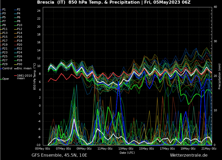 A conti fatti sembrerebbe un ottimo peggioramento per quasi tutte le zone pedemontane e montuose, fenomeni abbondanti ma più locali anche in zone pianeggianti. (ad ora mi sentirei di mettere in pole la Lombardia centro-occidentale). Peggioramento che non sarà troppo democratico, ma che andrà a dare una mano a molte zone assetate, come l'alto Piemonte e la Lombardia. Per il bresciano mi aspetto una buona dose di millimetri sui monti (30-40mm) a decrescere verso la pianura (qui gli accumuli dipenderanno molto dall'attività convettiva di domani pomeriggio).