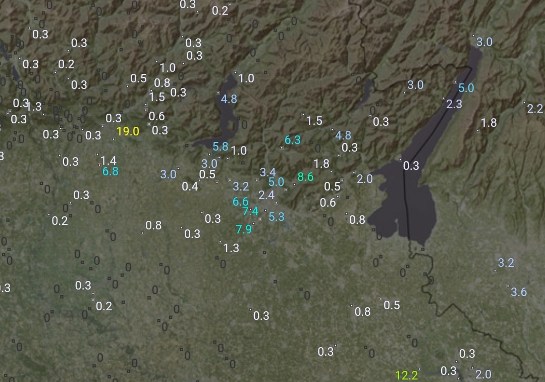 Accumuli disomogenei (come è normale in queste situazioni). Da me 0.4 mm, 3 a Mompiano, 6-7 nella zona S e SW cittadina. Ora gran casino in arrivo da NNE, obiettivo: Franciacorta e hinterland W bresciano! Buona probabilità di grandine