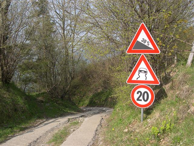 Per la Forcella però è parecchio ripida (il cartello dice 30% e non vorrei che siano stati ottimisti), stretta e a tratti cementata ai lati ma con acciottolato centrale. Non ho visto cartelli di limitazioni al traffico particolari, però non garantisco che sia transitabile a chiunque quindi meglio informarsi prima, anche perchè mi pare di ricordare che all'altro capo (croce di Marone) ci sia un cartello di divieto. :icon_wink: